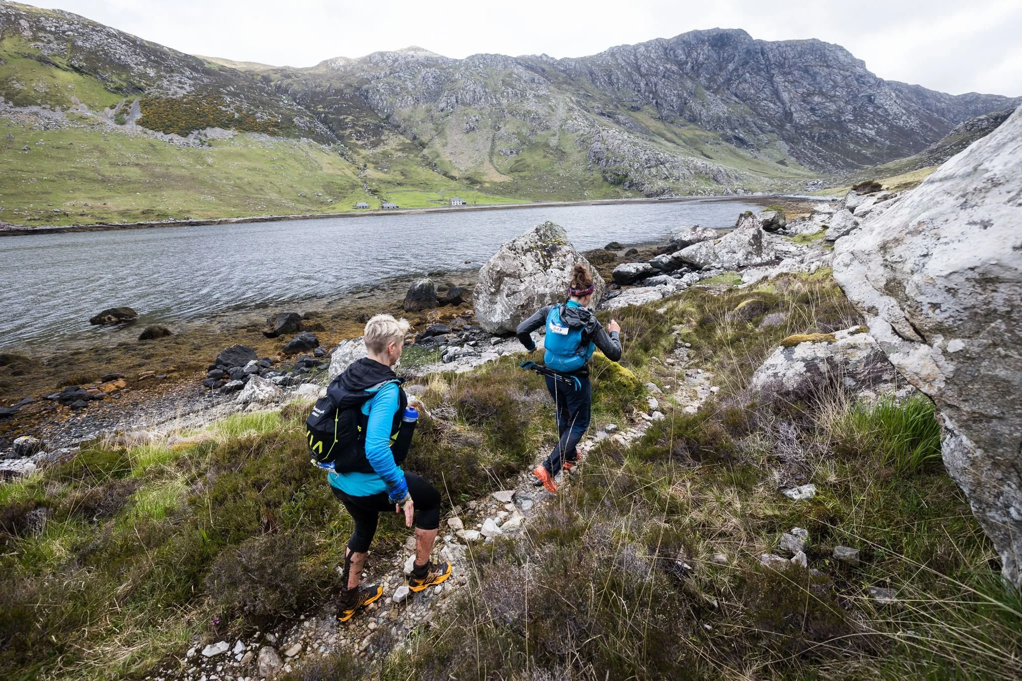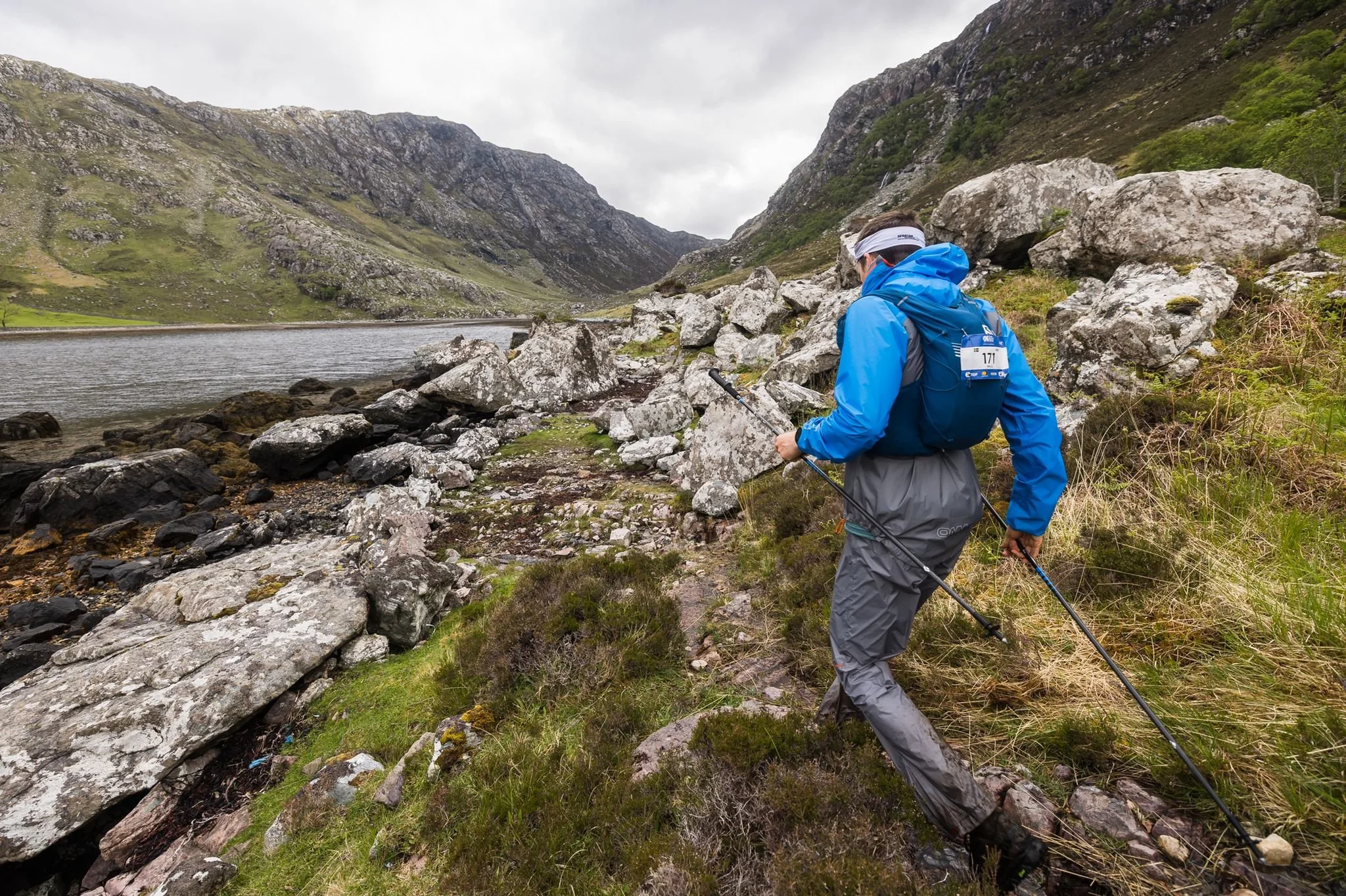The stretch of trail that bends around Loch Glendhu is gloriously runnable although undulating. The distinctive rock formations provided a beautiful backdrop for our participants today, as they enjoyed the drier weather and spectacular views of the loch. However, with over six days of hard running in their legs, most runners had slowed down now, with many opting for a fast hike rather than a run.