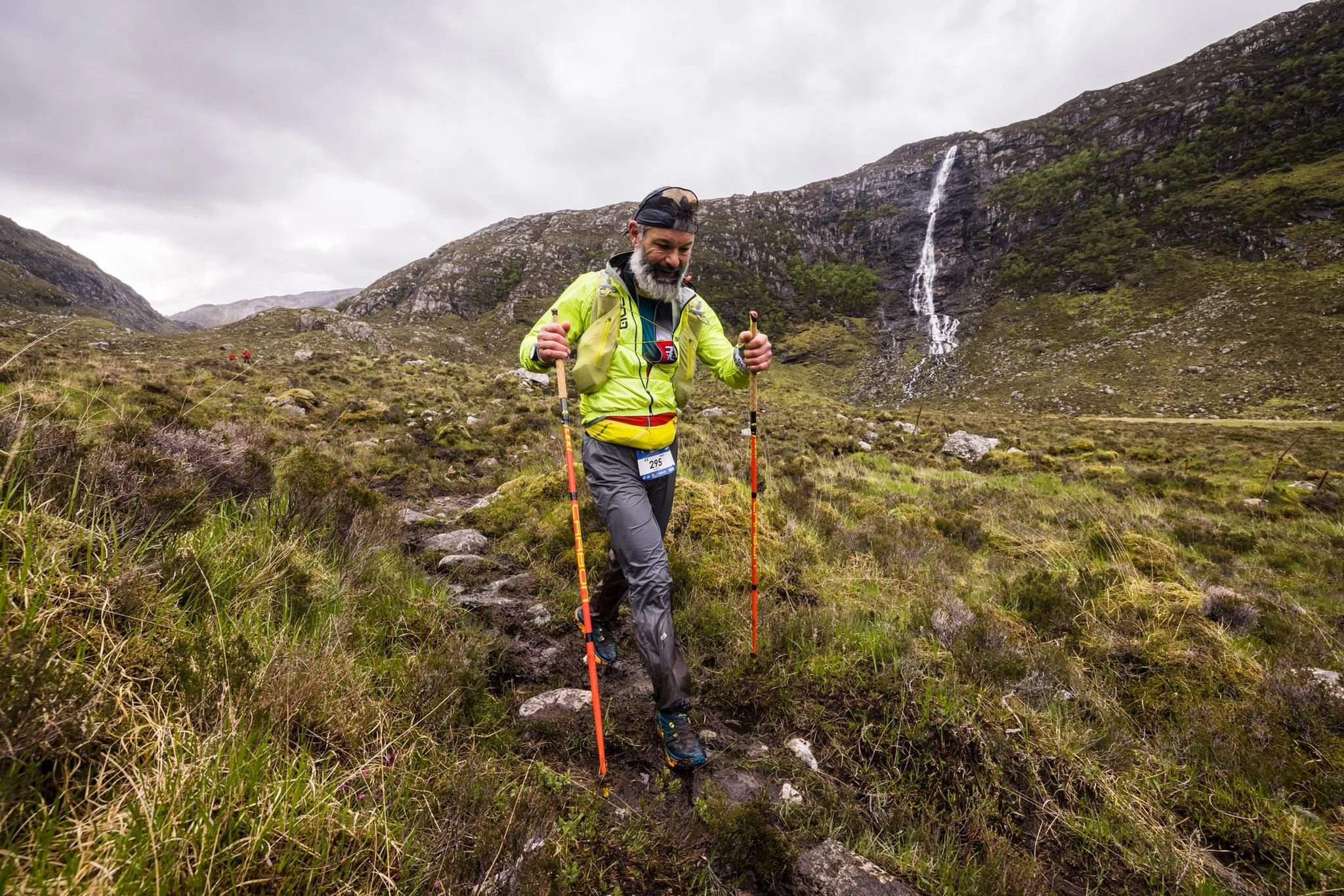 Today was the last of the longer days, with 61km of running over a hugely varied mix of terrain. The route took participants through some of the most breathtaking and rugged scenery in the north-west of Scotland. Participants passed by the highest waterfall in the UK, Eas a’ Chual Aluinn, and ran alongside some remote sea lochs, accessible only to those adventurous enough to explore on foot. The route of Day 7 culminated in a longer stretch of road. This was extremely tough for some participants, who found the hard tarmac particularly painful on already-exhausted legs, whereas others took the opportunity to pick up some speed on the flatter ground.